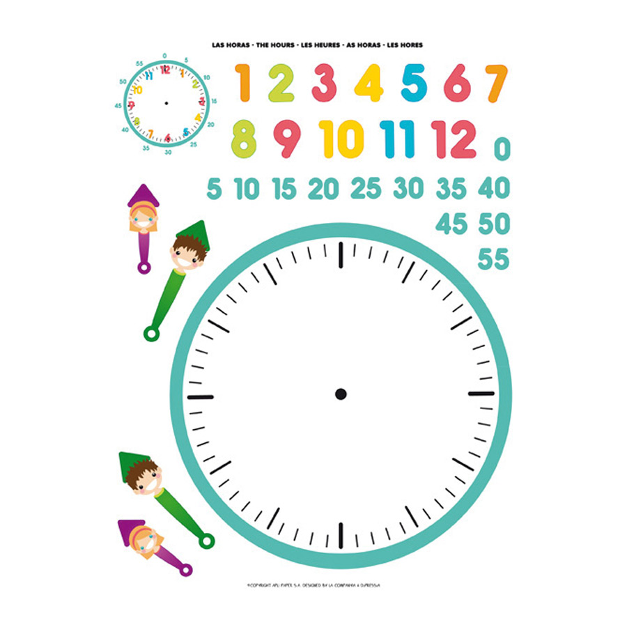 Leer kinderen klokkijken of gebruik ze voor het aanduiden van openings-/vertrektijden. Deze APLI Kids verpakking bevat 3 vellen met elk een wijzerplaat en sticker met wijzers en cijfers.