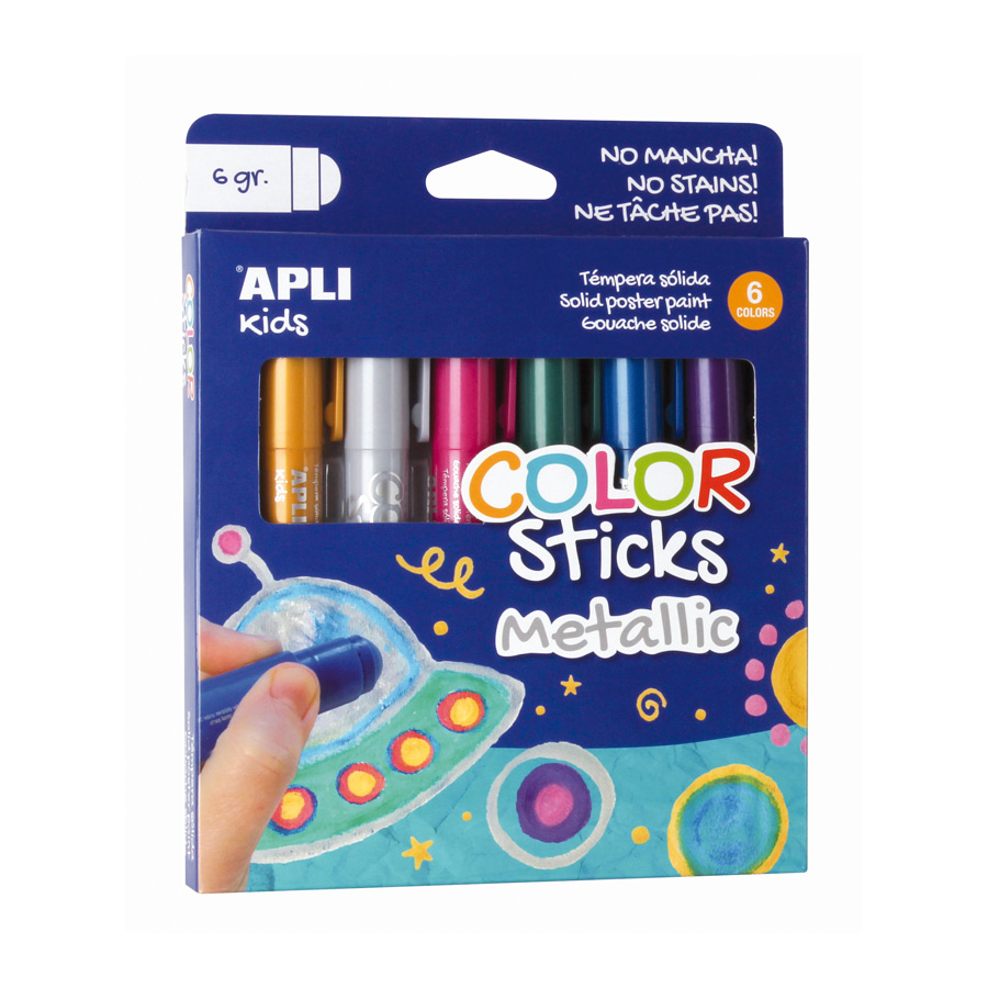 Plakkaatverf in massieve stift vorm met metallic effect. Geleverd in de kleuren donker blauw, roze, paars, goud, zilver en donker groen. Ideaal om te tekenen en te schilderen op papier, karton, kaart, enz. APLI Kids Color Sticks geven geen vlekken, hebben een satijnen afwerking, zodat ze geen vernis nodig is. Drogen snel, in minder dan 3 minuten, scherpe, levendige en intense kleuren. U kunt verschillende afwerkingen bereiken afhankelijk van de druk die wordt uitgeoefend: lichte druk = krijt effect; veel druk = dekkend effect. Als de tekening klaar is, barst hij niet, blijft flexibel en bevat geen oplosmiddelen.