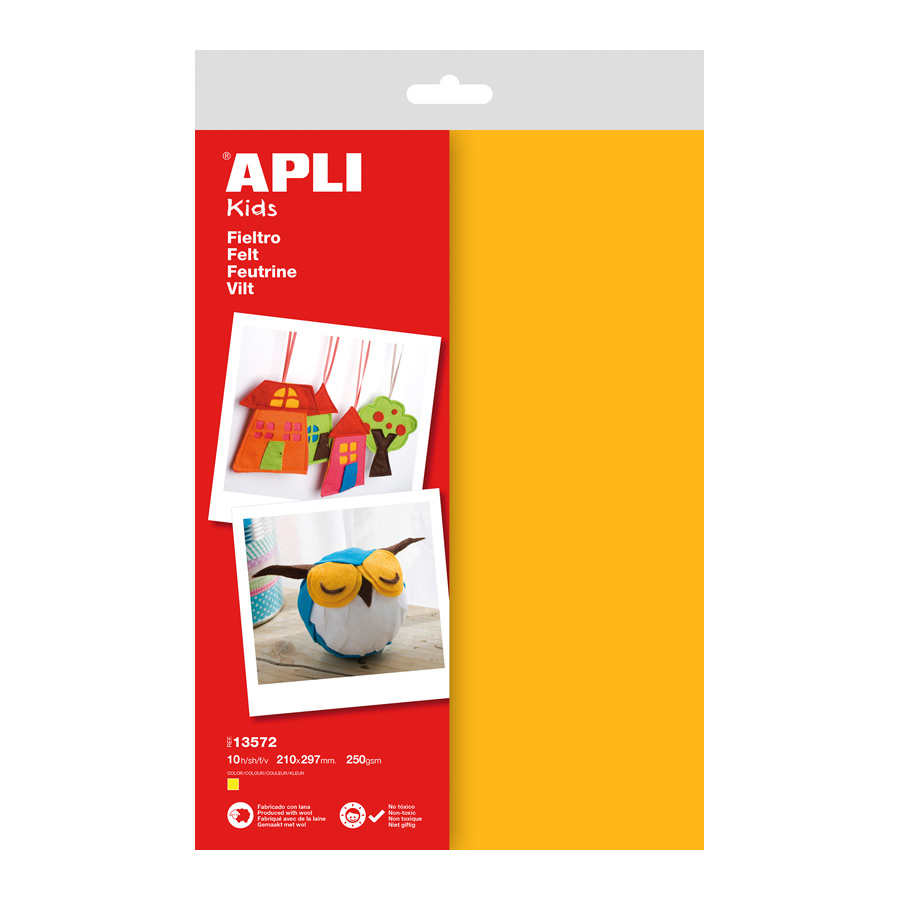 Vilt in A4 formaat. Elk pakje bevat 10 vellen. APLI-vilt bevat 40% natuurlijke wol en weegt 250 g/m², waardoor het meer taaiheid, zachtheid en kneedbaarheid krijgt. Makkelijk te beschrijven met markeerstiften, te knippen en te plakken. Ideaal voor het maken van decoraties met reliëf op felicitaties, kaarten, postkaarten, uitnodigingen, boeken, mappen…. of om poppen, sieraden, hoeden, poppen, kostuums, portemonnees, lijsten, tassen, enz. te maken.