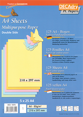 DECAdry heeft een ruim assortiment gekleurd papier, vele kleuren, verschillende papiergewichten en in diverse formaten naast de standaard A4 zoals we die allemaal kennen. Wilt u een afwijkend formaat, vraag naar de mogelijkheden!